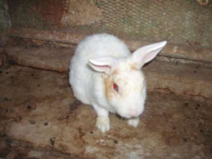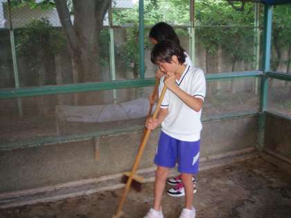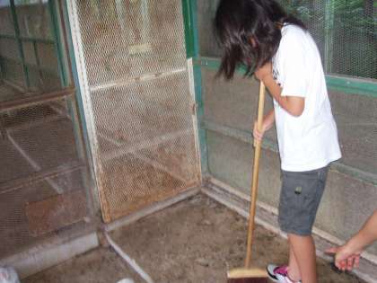 うさぎ小屋で一生懸命掃除をしています。