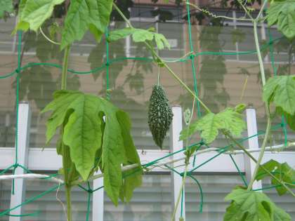 中庭の緑のカーテンのツルレイシに実が付き始めました。にがうり(ゴーヤ)というとてもにが〜い実です。でもとても体にいいものです。
