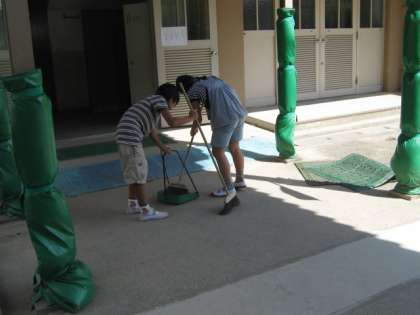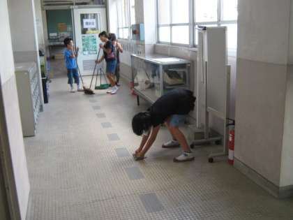 教室以外にも,渡り廊下や理科室前廊下を担当して,掃き掃除・拭き掃除とがんばっています。