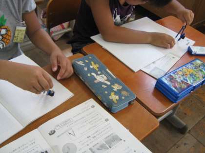 コンパスを使って円をかきました。コンパスを開いて,まず針をさします。コンパスの上を持ってくるっと回してまるい形をかきます。針がずれたり,線が途切れたり,ゆがんだり・・・四苦八苦しながらもいろいろなまるい形がかけました。このまるい形を円ということや,中心・半径という語句も学習しました。なかなかきれいな円がかけない子もいました。おうちでも練習してみてくださいね。