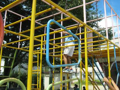 今日の中間休みに、総合遊具であそんだよ。とても暑かったけど、たくさん遊びました。