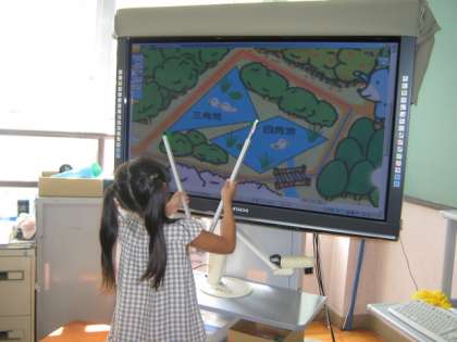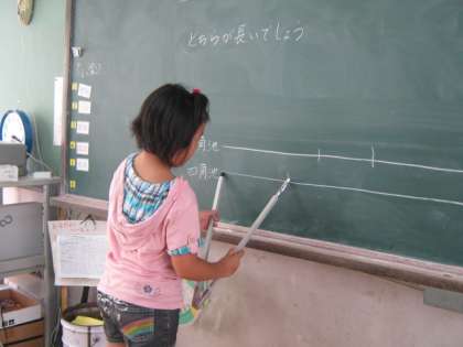 コンパスを使って直線を測りとる学習です。折れ曲がった直線の道の長さを比べたり,三角池と四角池の周りの長さを比べたりします。折れ曲がった線も,直線をまっすぐにつなぐことで長さを比べられることがわかりました。