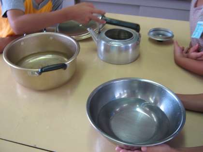 「どの容器の水が一番多いかな?」とみんなで考え,「同じもの(コップ)ではかったらくらべられるね。」と学習しました。これから,水のかさを表す単位についても学習していきます。