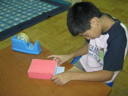 今日、算数の学習で箱作りをしました。テープで付けるところが難しかったけど、きれいにできました。