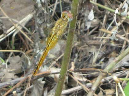 畑のところで、ウスバキトンボを見つけました。ウスバキトンボは、おすもめすもきれいなオレンジ色をしています。