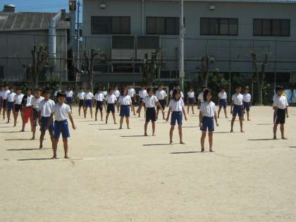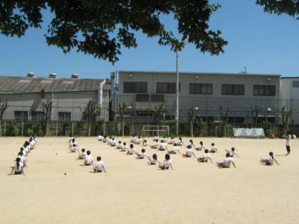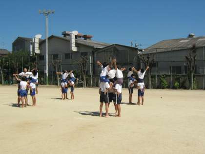 体育館で練習していた組体操を,始めて運動場で練習しました。