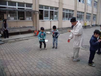 1月24日(火),1年生が生活科の学習で「昔の遊び」を体験しました。学校運営協議会の方々から昔の遊びについて教えていただき,実際にコマ回しや凧揚げ,けん玉といった遊びを体験しました。最近ではあまりしない遊びですが,いざ始まると夢中になって遊び,雪もちらつく寒い日でしたが,子どもたちは外で元気に学習していました。