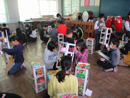 図工の学習で作ったコロコロガーレの鑑賞会を1・2組合同でしました。