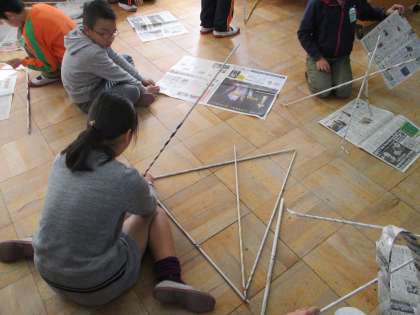 「どんどんつなげていたら,ピラミッドができたよ。」「四角いおうちみたいな形になったな。」などと,新聞紙の特性を生かしながら,楽しく学習を進めることができました。