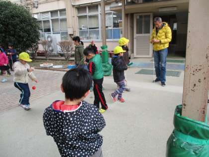 寒い中,地域の方々がたくさん来てくださり,こままわしを楽しみました。お手本を見せてくださったり,手を取って一緒にまわしてくださったり・・・ていねいに教えてくださいました。みんな,こまがまわせるようになり大喜びしました。ありがとうございました。
