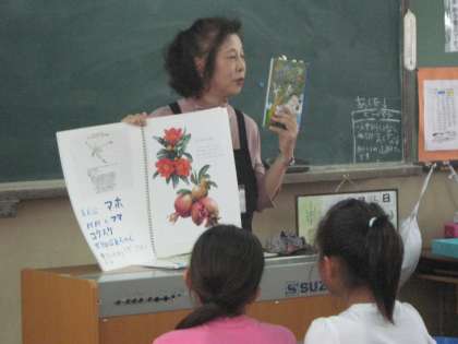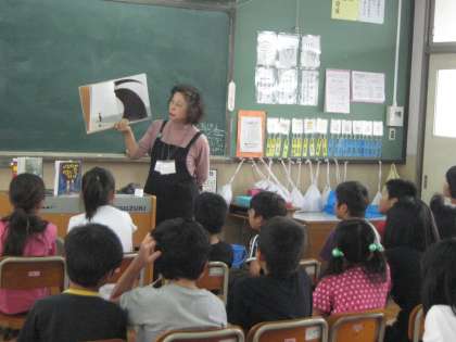 お話を絵にするコンクールに向けて,本の紹介などをしに,読み聞かせキャラバンの方が来てくださいました。