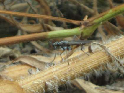 畑のところで、クロバクキバチを見つけました。クキバチ科のはちで、植物のくきに卵をうみつけます。稲などにも産み付けたりするので、これも害虫です。