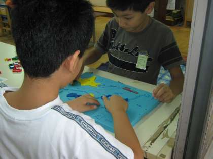 今日の中間休みに、パズルゲームをしました。日本地図のパズルで、都道府県が1つ1つばらばらになっているのを、完成させていきます。二人で協力したので、簡単にできました。またしたいです。