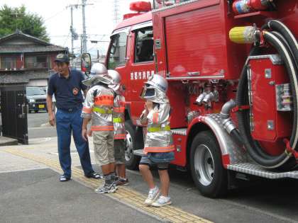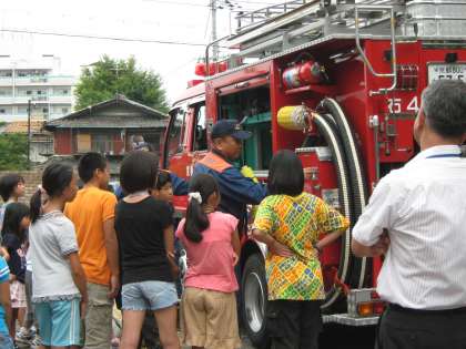 消防車の仕組みについて,教えていただいている様子です。