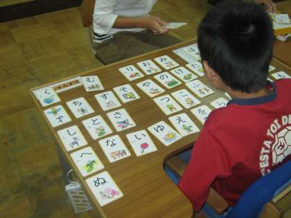 今日、国語の学習でひらがなの学習に取り組みました。たくさんのカードの中から、指定されたカードを1枚取ります。すべて取りきることができました。