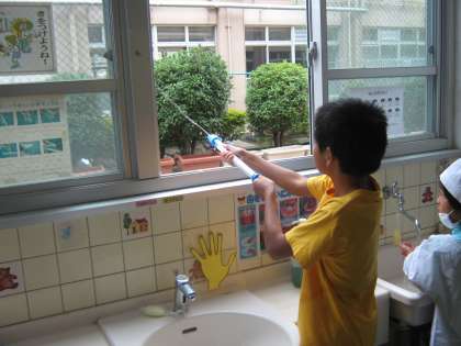 理科で学習した実験道具を使って、水鉄砲遊びをしました。たくさん飛ばすことができて、とても面白かったです。