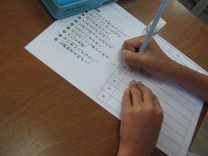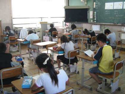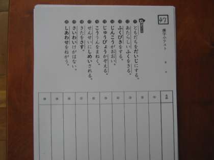 前期の漢字の復習テストを毎日がんばっています。宿題で練習をしてきた20問を,10問ずつ2枚のテストに分けてやります。全問正解するのはなかなか難しく四苦八苦していますが,家で何度も練習してくるなど努力して,少しずつ書ける漢字を増やしています。