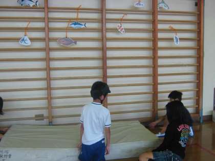 今日、体育の学習でろく木登りを頑張りました。つるされた魚のカード目指して登っています。
