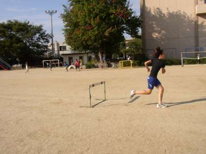 陸上記録会に向けて,「50メートルハードル走」の練習を毎朝10分間ほどしています。少しずつ高さとハードルの間の距離に慣れてうまくなってきました。