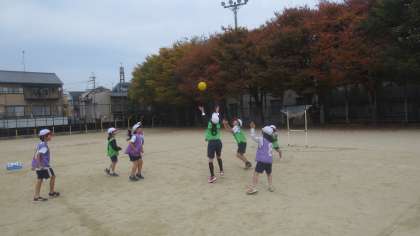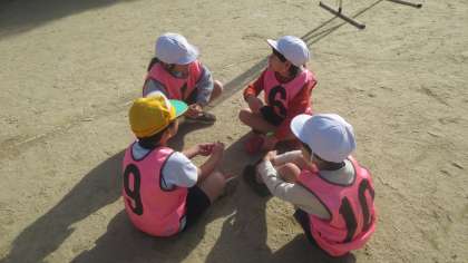 いよいよパスゲームも終盤です。チームで攻め方や守り方を話し合う作戦タイムを充実させ、より楽しいゲームにしていきます。話し合う力を生かして、活動していってほしいと思います。