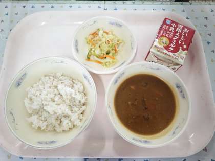 今日は大人気献立「チキンカレー」です。給食のカレーやシチューは全てルーから手作りしています。中間休みが近づくと、給食室からルーを作るクッキーのような甘い香りが漂ってきます。食べる時だけではなく、作っている時にも給食の香りを楽しむことができるのは自校調理の良いところですね。