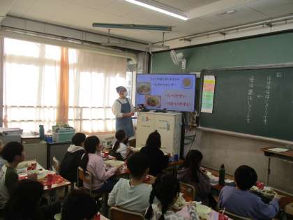 栄養教諭の高橋先生の給食指導がありました。今日の給食メニューの「まめじゃこごはんのぐ」について、くわしくお話をしてもらいました。お話を聞いた子供たちは、いつも以上に味わって給食を食べていました。