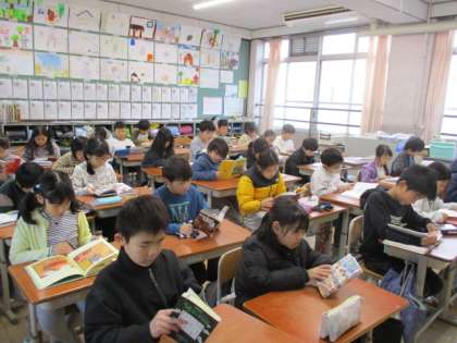 全校児童が、朝の10分間、自分の好きな本を読んでいます。