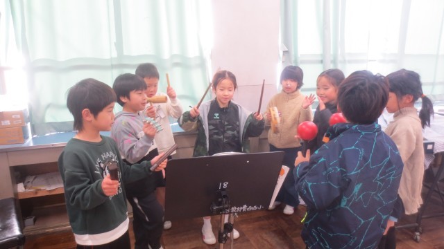 音楽科の学習では、打楽器を使って音の重なりを見付けました。