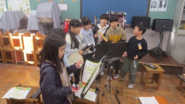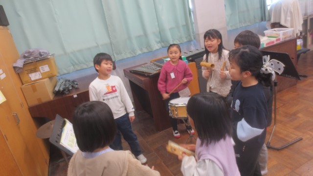 他のグループの演奏を聴き、「楽器の音が増えると楽しい感じがします。」「リズムが合っていて強くなるのが分かりやすかったです。」と活動を振り返り、楽器を演奏する楽しさと友達と音を重ねる難しさを学ぶことができました。