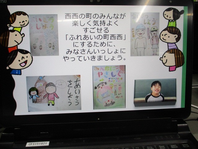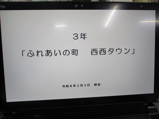 2月の朝会は、3年生の福祉教育の発表です。3年生は、総合的な学習の時間に地域のお年寄りの方と仲よくなるためにできることを考え実行してきました。お年寄りのお家にお手紙を届けたり全校みんなに提案してプレゼントをつくったりしてきました。今日は今までの活動を振り返り、これからできることを全校のみんなに発信しました。