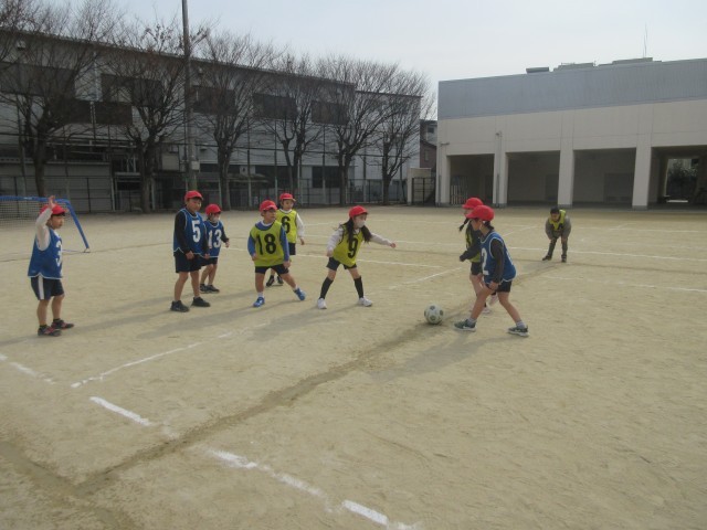 「みんなにパスを回そう!」「ナイスゴール!」と前向きな声をかけ合いながら、協力できています。