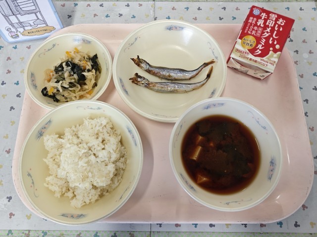 今日はスチコン献立の「やきししゃも」です。ししゃものように頭から尻尾まで丸ごと食べられる魚は骨を一緒に食べることでカルシウムも摂ることができます。一緒に給食を食べた3組さんの子供たちも、おいしそうに食べていました。