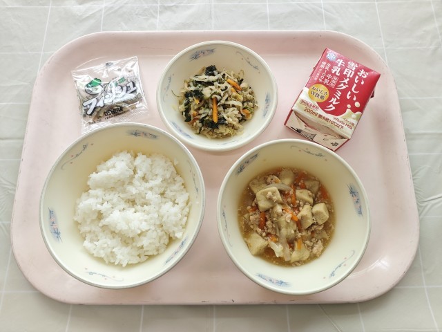 今日は「じゃこ」について子どもたちに紹介しました。じゃこという名前の魚はおらず、給食のじゃこはカタクチイワシであることを知った子どもたちは驚いた様子でした。初めて食べた一年生も「少し甘い味がする!」「しっぽの方がおいしい!」と、しっかり味わって食べていました。