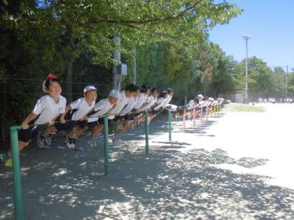 青空のもと,体育の時間に鉄ぼう学習を行いました。