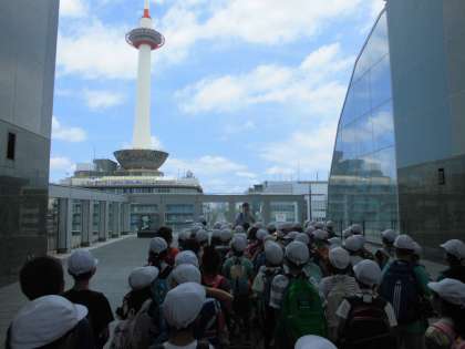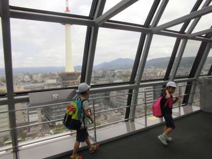 京都駅烏丸中央口前に立つ地上131m、京都のランドマークである京都タワー!子どもによっては家からも見ることができるそうです。