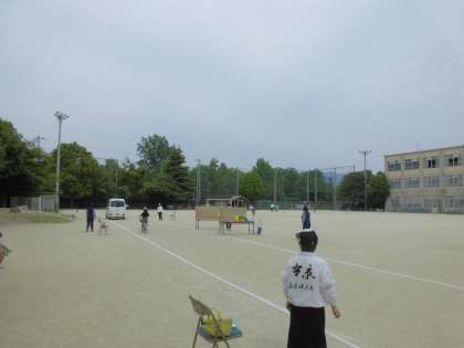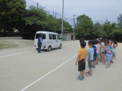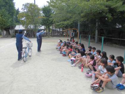 4年生を対象に,婦警さんに自転車の安全な乗り方について話をしていただき,その後実技試験を運動場で行いました。