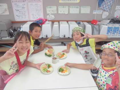 事前に学習したゆでる調理の特徴を思い出しながら,班で協力して取り組むことができていました。にんじん,ブロッコリー,キャベツを使ったカラフルコンビネーションサラダはどの班も成功していたようですが,ゆでたまごはなかなかうまくいかなかったようでした。それでも,食べるときには「おいしい!」と笑顔がいっぱいでした。