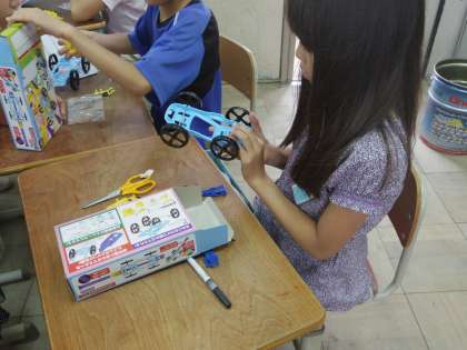 理科では「ゴムや風でものをうごかそう」という学習をしています。ゴムでうごく車を作って,ゴムの力を調べます。子どもたちは,完成した車を見て「早く実験したい!」とワクワクしていました。
