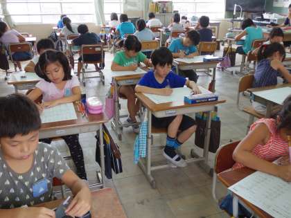 シーンと静まりかえった教室の中で聞こえる鉛筆のカリカリという音が心地よいです。みんな一生懸命頑張っています!!