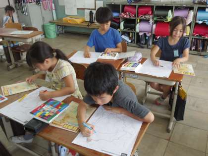 社会では「京都市の様子」を学習しています。白地図を使って京都市の地図を完成させます。実際の地図を見ながらクーピーで色分けして作っています!いろいろな川や鉄道がどこにあるのかがよく分かりました。