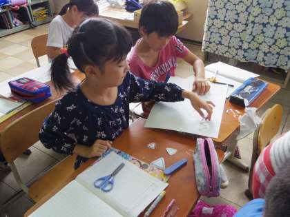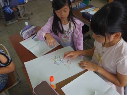 三角形は3つの辺でできていることを確認し,「これは3つの辺が同じ長さのやつ!」「これは3つともバラバラや。」「2つの辺が同じかな?」と友達と相談しながら三角形の仲間分けをしました。