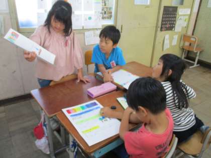 町探検でインタビューに行ったお店や施設についての新聞を書きました。今日はその交流を行い,グループで質問や感想を言い合いました。質問に対しても自分の知っていることを分かりやすく答えることができていました。