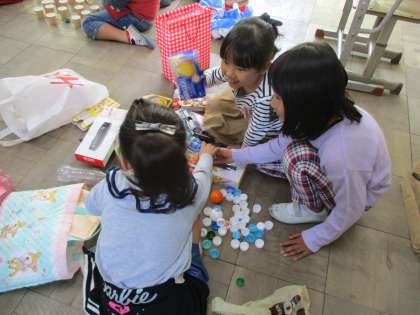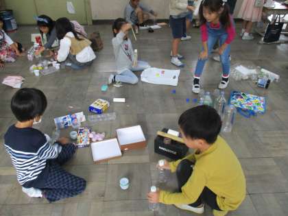 生活科で「あそんでためしてくふうして」という学習を行いました。今日は持ってきた材料をつんだり,ころがしたり,ならべたりして遊び,次の時間にどんなことをしたいかを考えました。「ボーリングみたいにしてみたい!」「みんなの道具を積み重ねてお城を作ってみたよ。」と想像力をいっぱいに使ってあそんでいました。