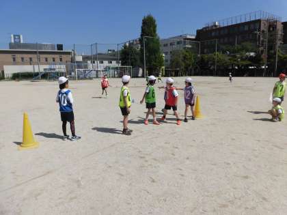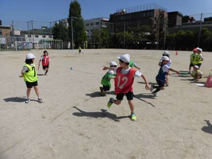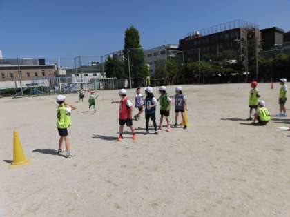 でもやってみなければわからない!ということでさっそく5チームに分かれてリレースタート!並ぶ順番やバトンのもらい方,渡し方などまだまだですが,みんなとっても楽しそうに走っていました。