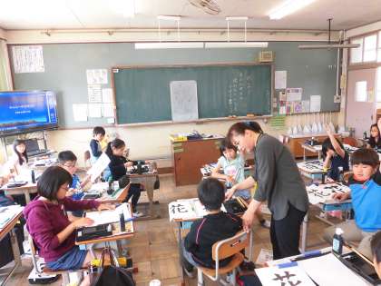 教科書のお手本をよくみて,一画一画の特徴をとらえ,いざ半紙に!
