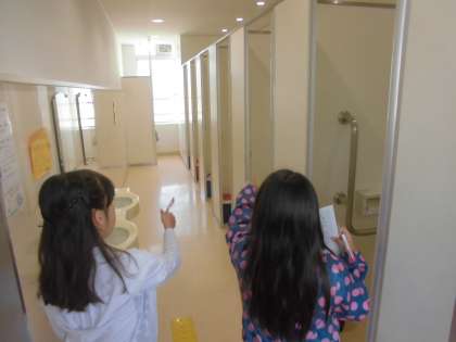 社会の学習で水がどこから来るのか,どうやってきれいになるのかを学んでいます。そこで,校内の水道の蛇口やトイレの数はどれぐらいあるのか調べにまわりました。