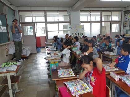 ABCの歌を歌ったり,絵の中に隠れているアルファベットを探したりしました。中でもポインティングゲームは盛り上がりました。コリー先生が言ったアルファベットを絵の中から探して指をさします。ペアでどちらが先に見つけることができるか競って楽しみました。