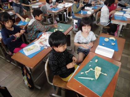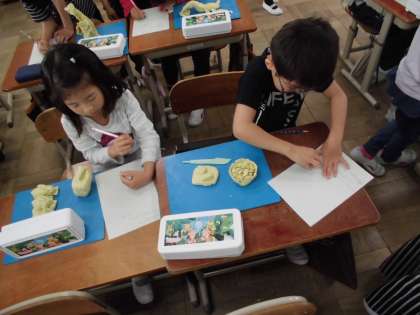 今日の図画工作科では,ねん土をにぎって,どのような形に見えるかを想像し,作品を創るという活動をしました。想像の生き物からおいしそうな食べ物まで,子どもたちは思い思いの作品を仕上げ,互いの作品を鑑賞していました。