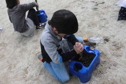 今日は,ミニトマトを育てるための植木鉢の準備をしました。前に植えていたチューリップの球根や雑草を抜いて,新しい土と肥料を入れて混ぜました。ミニトマトの苗が届いたら,すぐに植えられるように準備が整いました。苗が届くのが待ち遠しいです。