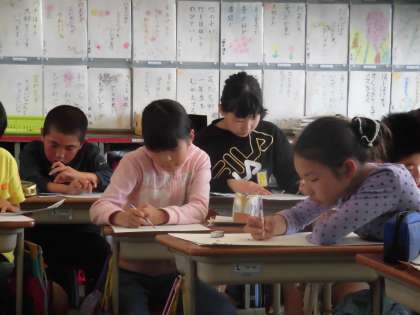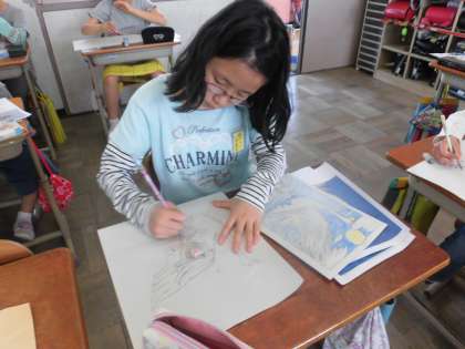 『愛鳥ポスター』を描くために下書きを丁寧に行っています。